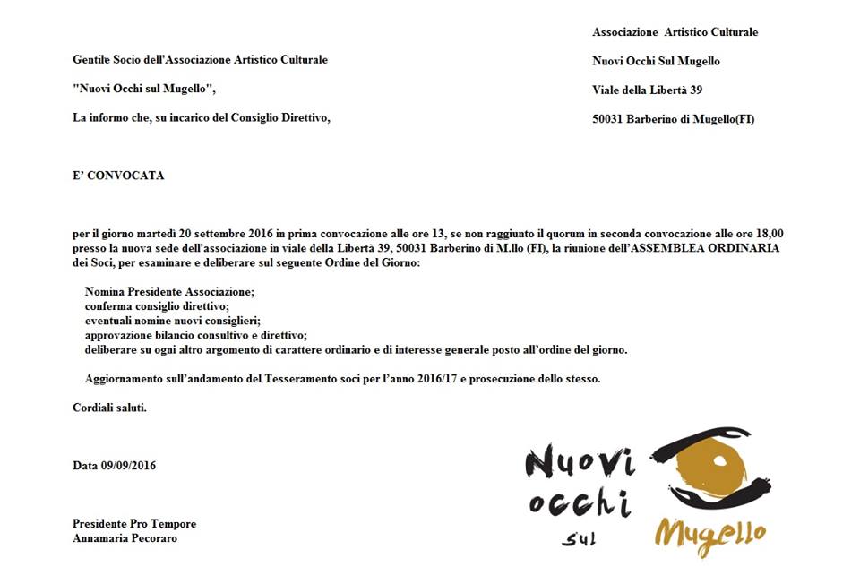 CONVOCAZIONE ASSEMBLEA ORDINARIA SOCI NOSM9 Settembre 2016/0 Commenti/in Eventi & News/da annamaria https://www.nuoviocchisulmugello.it/wp-content/uploads/2014/12/logo_nuovo.png 0 0 annamaria https://www.nuoviocchisulmugello.it/wp-content/uploads/2014/12/logo_nuovo.png annamaria2016-09-09 22:49:172016-09-09 22:56:31CONVOCAZIONE ASSEMBLEA ORDINARIA SOCI NOSM