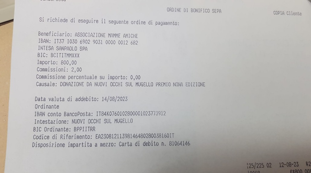 in allegato il nostro/vostro contributo (800€) di questa edizione la nona edizione del premio Nuovi Occhi del Mugello, svoltasi il 24 giugno 2023 nel teatro Giotto di Vicchio, andato a favore del Progetto MammeAmiche onlus, sezione Mugello, gruppo di auto- aiuto mamme nella fase della gravidanza e post gravidanza e non solo. (https://www.mammeamiche.org/)